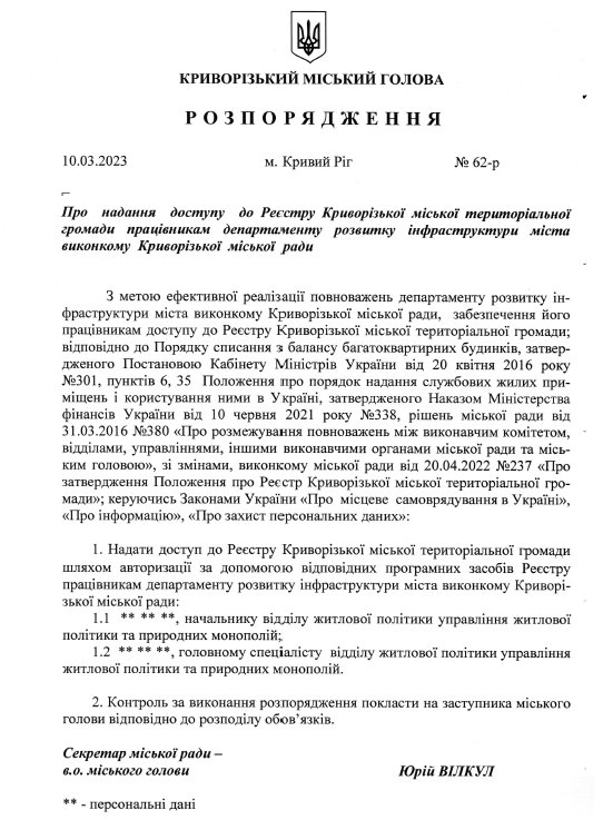 Про надання доступу до Реєстру Криворізької міської територіальної громади працівникам департаменту розвитку інфраструктури міста виконкому Криворізької міської ради
