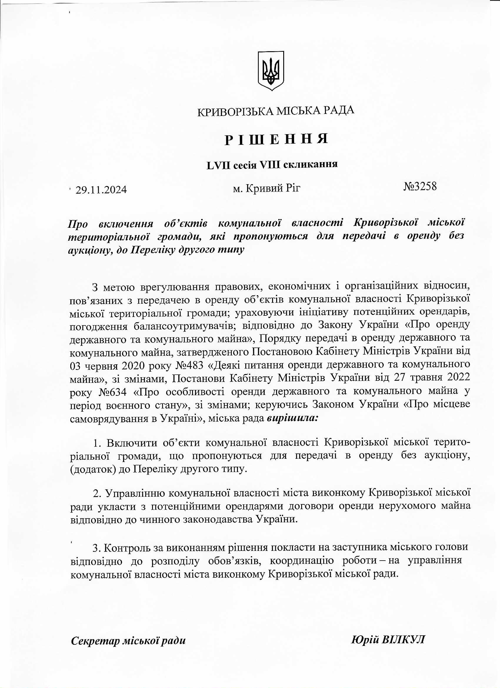 Про включення об'єктів комунальної власності Криворізької міської територіальної громади, які пропонуються для передачі в оренду без аукціону, до Переліку другого типу - Рішення № 3259 від 29.11.2024: